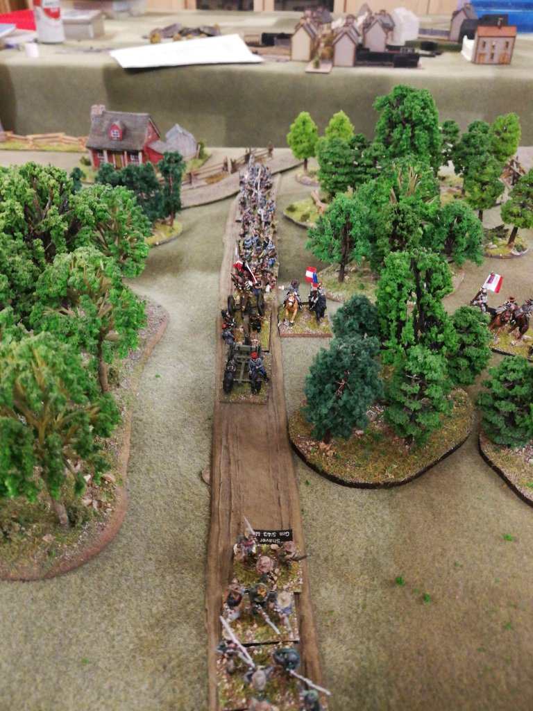 It was about this time that my first reinforcing Brigade appeared over on the right but this good news was tempered by the sight of a mass of Confederate Infantry & Artillery appearing on the roads opposite, I quickly ditched any idea of attacking obliquely into the flank of the enemy before me and realised I’d have to use the reinforcements to tackle the newly arriving enemy forces head on. I therefore advanced my new Brigade forward a short distance and shook it out into a supported line to wait for the rest of its Division. Pretty soon the rest of Husson’s Division’s brigades with their attached 3 batteries of guns had arrived and I wasted no time in advancing them towards the masses of enemy advancing down the road, shrugging off the attentions of enemy artillery as they did so. My own artillery was also now in play and the concentrated fire of all 3 batteries was beginning to tell on the green rebel troops, causing them to become disordered and silencing their batteries.