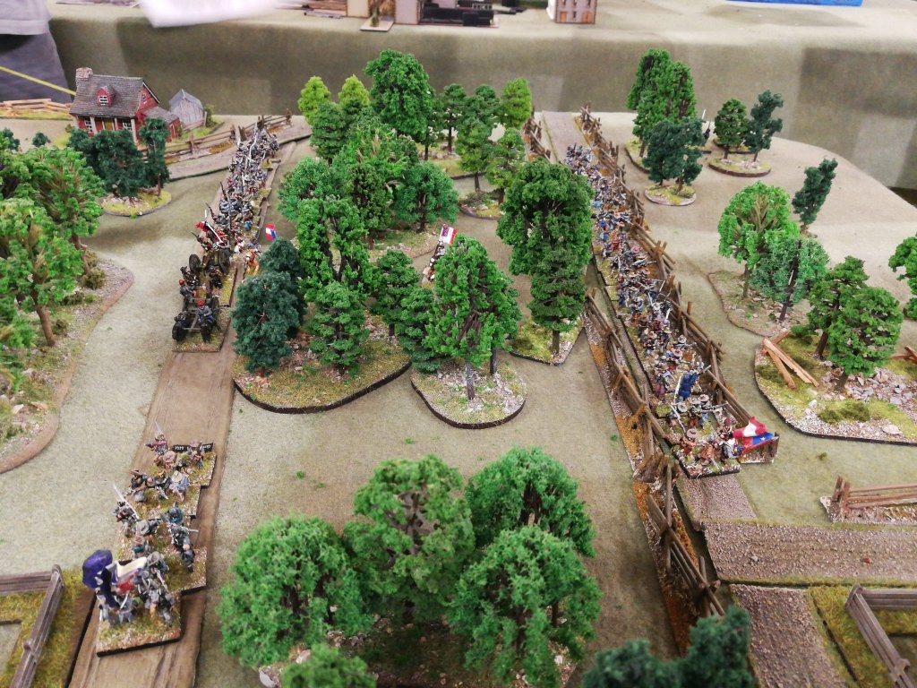 Now, as twilight started to fall, the battle moved into the final stages as the infantry started to get to grips with each other. Over on the left I had decided to launch Huston’s brigade forwards in a charge on Fagan’s Brigade to tie them in place while Orne’s Brigade got into position on the left, unfortunately this attack which was stopped cold by the fire from the enemy infantry and the remaining guns across the road and a quick counter attack saw my brave boys retreating back to the safety of the foot of the shelf. However the Rebel infantry was now disorganised and Orne’s fresh and large unit slammed into the enemy line, bundling them back at an angle with some loss and destroying the remainder of Blocher’s battery. This did leave the victorious Union troops with enemy troops moving up on their flank but they were still fresh and in good order so would easily be able to turn to face the new threat with confidence.