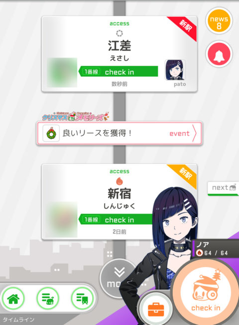 ゲーム画面はこちら。画面右下にあるチェックインボタンを押すと、そのとき一番近くにある駅にチェックインすることができる。ここでは「新宿」となっている新宿で押したからだ。