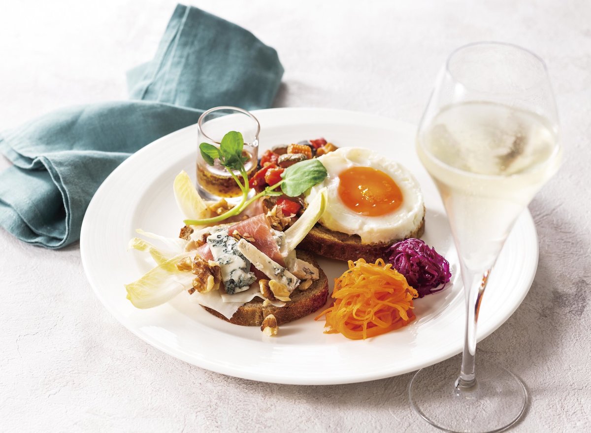 「ワインに合うサンドイッチ」がコンセプト。 ライ麦を使用した味わい深いパンに、 ラタトゥイユと目玉焼き、 生ハムとゴルゴンゾーラチーズをのせました。 別添えのハニーマスタードソースで、 味わいにアクセントをつけても。