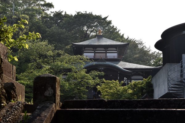「愛染寺」は、1日に湖水の色が7色に変化すると言われる柴山潟(しばやまがた)と、その柴山潟から湧き出す片山津(かたやまづ)温泉を一望できる高台にあります。柴山潟越しには、日本三大霊山のひとつである「白山」の姿も。