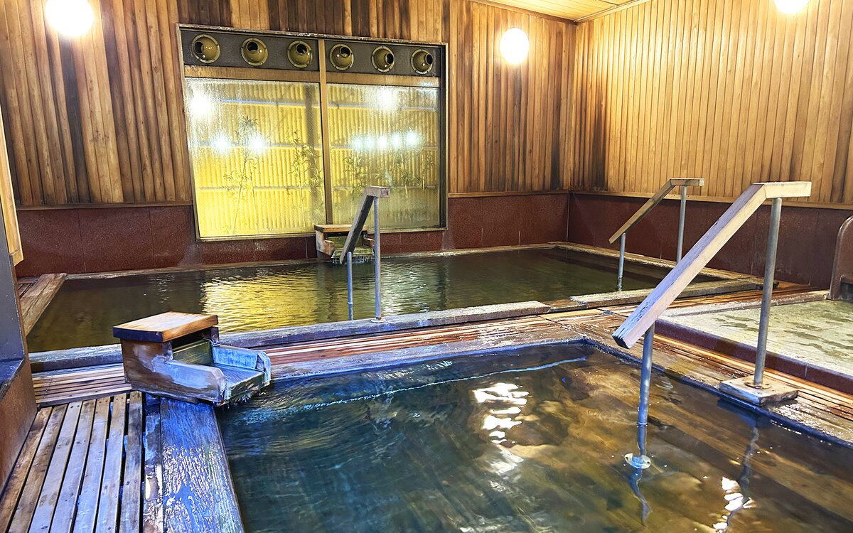 地元の方々からお気に入りの声を聞くことが多いのが、透明からグリーンに輝く湯が美しい「戸倉観世温泉」。広々としたタイルの浴槽は深い部分と浅い部分とに分かれていて、浅い部分で半分寝そべるように湯に浸かるのが気持ちよく、極楽を体験できます。小さな檜の浴槽にはぬる湯の異なる源泉がひかれ、2種類の源泉を味わえるのもオツ。