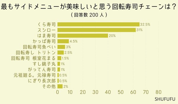 そこで今回は、男女200人に聞いた「最もサイドメニューが美味しいと思う回転寿司チェーン店」ランキングをご紹介。第1位は一体どこなのか、早速チェックしてみましょう。