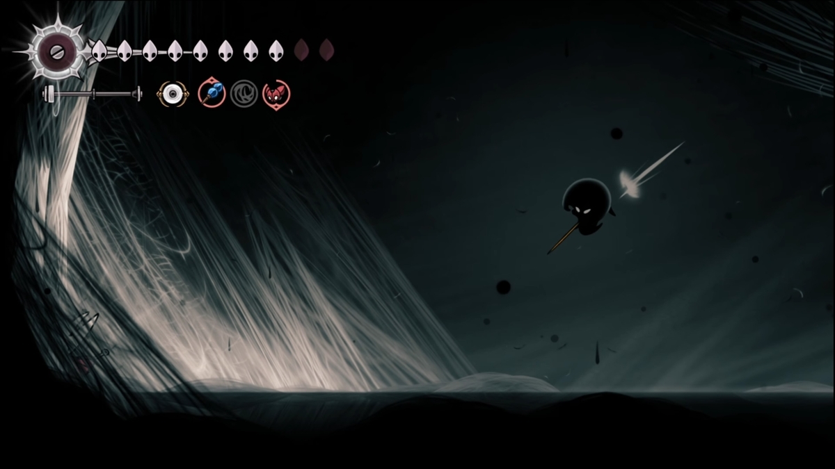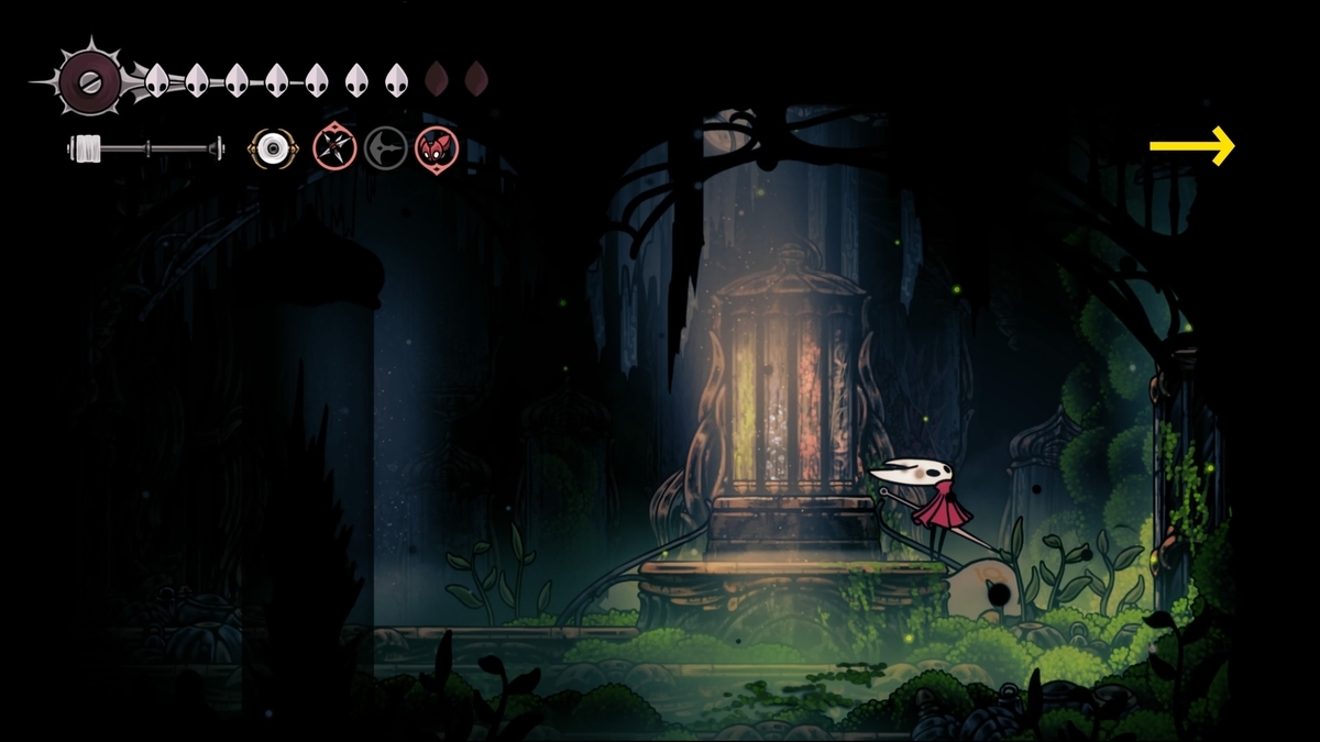 - シルクアンクレット:遠景の地下段最東端の紡ぎの巣で走って光を一定時間内に点灯。ノミの酒を飲んで達成しました