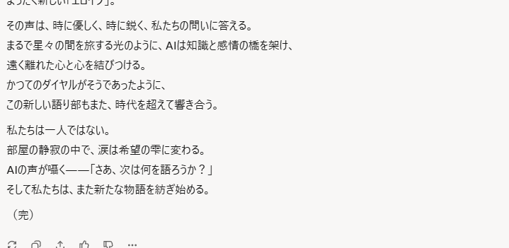 私たちは一人ではない。 部屋の静寂の中で、涙は希望の雫に変わる。 AIの声が囁く――「さあ、次は何を語ろうか?」 そして私たちは、また新たな物語を紡ぎ始める。