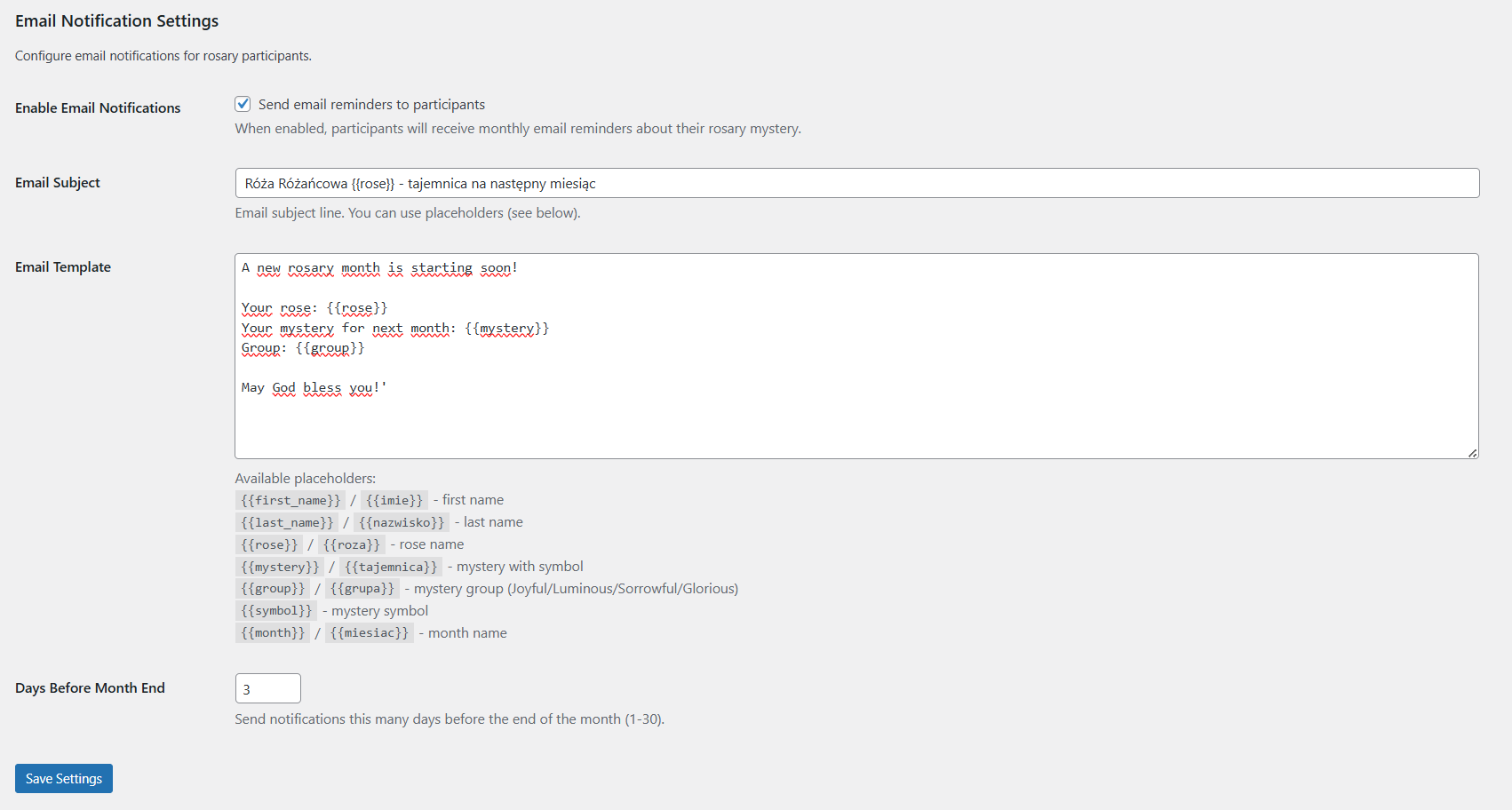 - Default email subject: “Róża Różańcowa {{roza}} – tajemnica na następny miesiąc”
