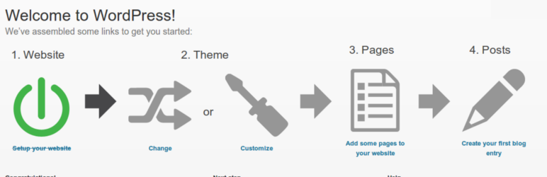 WP Getting Started replaces the WordPress Welcome Panel (the one you see on the Dashboard after a fresh WP installation) with a simple 4 step walkthrough: choose and/or customize your theme, add pages and add posts.