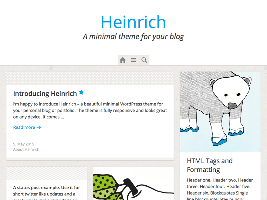 Heinrich is a beautiful minimal WordPress theme for your personal blog or portfolio. The theme is fully responsive and looks great on any device. It comes with two widget areas, a social link menu, four post formats (standard, status, link and image) and featured images for posts and pages. Heinrich is translation ready and currently available in English and German.