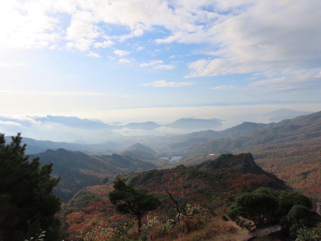 紅葉のピークは1週間前くらいだったみたいで、この日の山頂付近はピーク過ぎのような風景になっていましたが、雲海とうっすら浮かんで見えた瀬戸内海の島々と終盤を迎えつつあった山肌の紅葉が幻想的できれいでした。