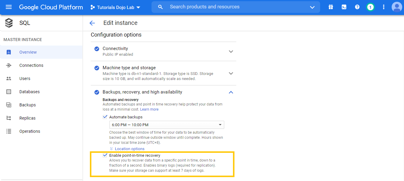 - Choose Cloud SQL (MySQL) and verify that the enable binary logging option is selected.
