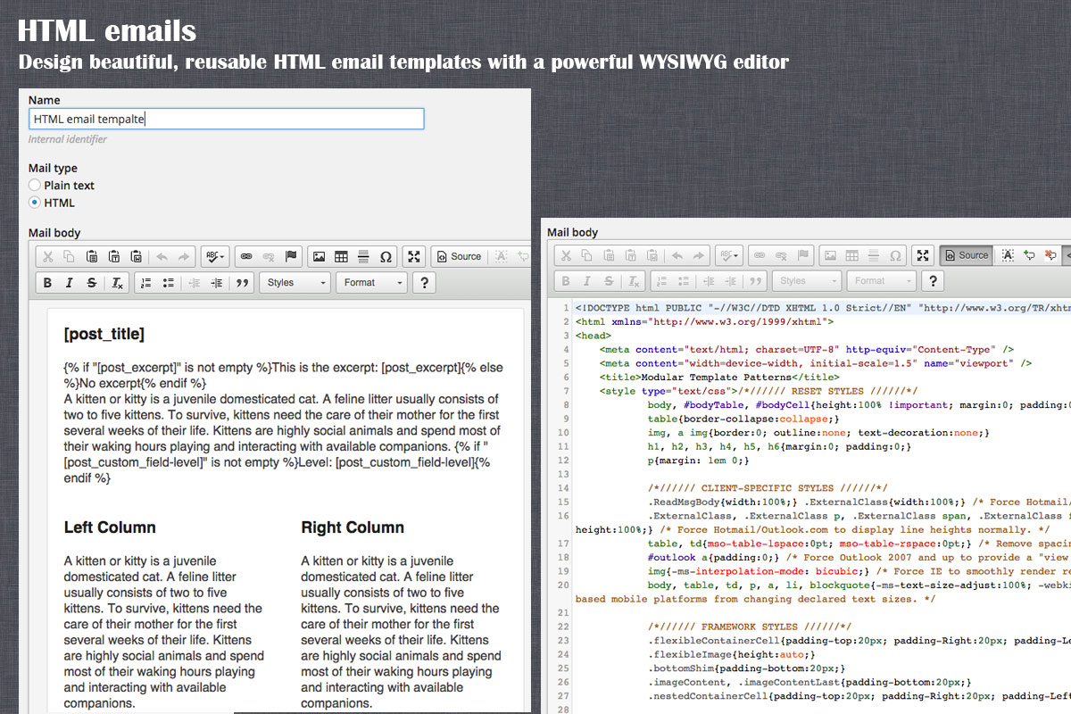 - New Premium feature: Support for conditions, loops, functions and filters in subject and body texts. Enables to access any kind of data attached to a post. Allows to create dynamic texts.