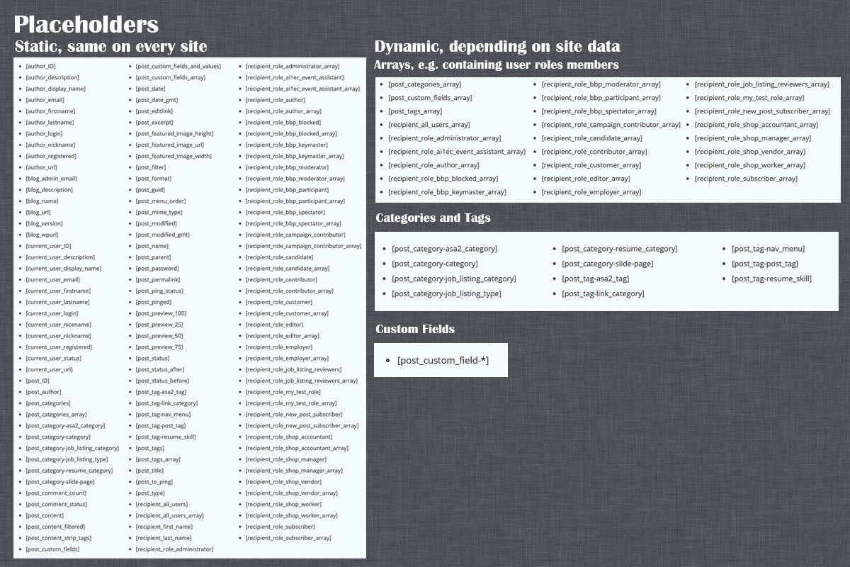 - New placeholder: [post_custom_fields_array] Contains an array for easy use with filters
