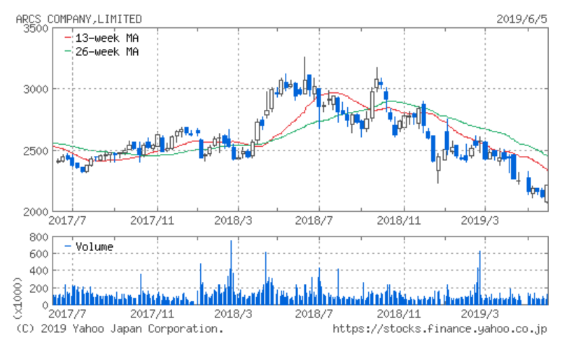 2年チャートみてみると綺麗な右肩下がりのチャートとなってますが、そろそろ下げ止まり感も出てる気もしますね。株式市場的には地味な業種で一部を除いては出来高もあまりないので今のこの位置ですと上がっても下がってもそんなに利益も損も無いかも。そう言った意味では長期保有もありかと思います。