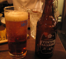 「半立ち」と銘打たれた看板がなんとも怪しい感じですが、店内はレトロな感じで新宿などにある「日本再生酒場」のような雰囲気。そして半立ちの所以となっているイスは、ビールケースを二つ重ねた簡易なもの。半立ちなんて辛い体勢ではなく、ちゃんと座って呑むことができます。そして注文したのはS先輩はビール。ボクは氷なしで黒ホッピー(セットで400円)をいただくことにしました。