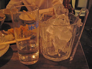 やっぱり焼酎は、ペットボトルに入った「一等星」を常温で同じコップに注いでくれます。それでは、ということで氷をもらうと、これがたっぷり大サービス。こんなにいらないよ、ってくらい氷を持ってきてくれました。