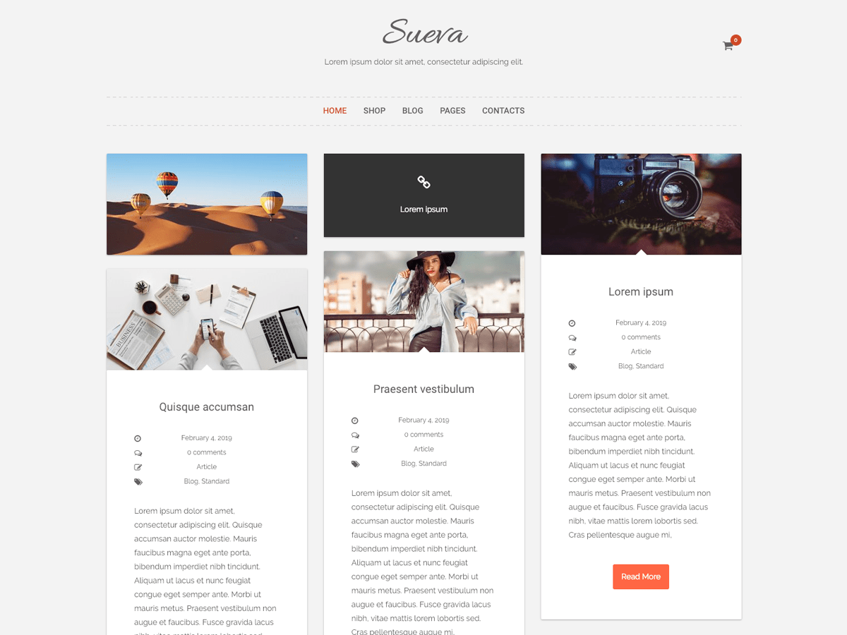SuevaFree – це безкоштовна чиста і мінімалістична тема для блогу WordPress, з додатковим мінімальним макетом і односторінковим розділом, яка ідеально підходить для управління вашим особистим блогом, блогом про спосіб життя, подорожі, їжу, рецепти або моду. Ви можете налаштовувати та керувати багатьма розділами SuevaFree за допомогою WordPress Theme Customizer, наприклад, 5 різних макетів заголовка, два різних макети для бічної бічної панелі, деталі публікації, розділ нижнього колонтитула та багато іншого. SuevaFree також готовий до електронної комерції та оптимізований для роботи з плагінами WooCommerce і Contact Form 7. Розділ блогу має гарний макет сітки кладки, і ви можете створити галерею в стилі pinterest, додавши формати записів зображень. Тема підтримує всі сучасні браузери, такі як Firefox, Chrome, Safari, Opera та Internet Explorer 8, 9 і 10,і використовує найсучасніші технології, такі як HTML5 і CSS3. Для управління односторінковим розділом потрібен плагін SuevaFree Essential Kit.