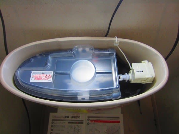 接着剤が乾いた頃を見計らってトイレを組上げた。自動で流すモーターユニットを取付けた。