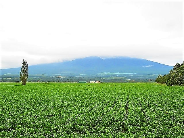 みどり工房の朝。今朝も斜里岳には雲がかかって頂上が見えない。