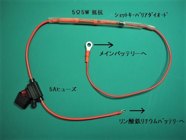 ヒューズ + 5Ω 5Wの抵抗 + ショッキーバリアーダイオードを直列で接続するだけ。