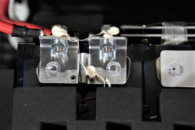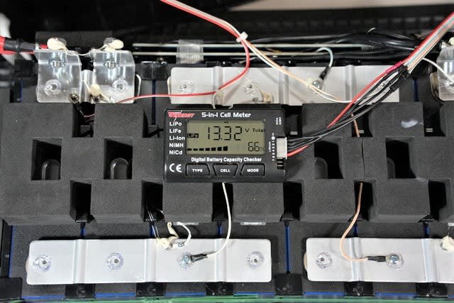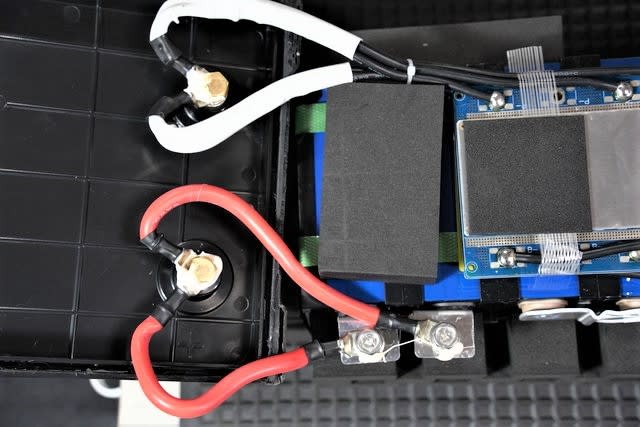 右上の白いリードは温度センサーで、その下はセルの電圧測定リード。