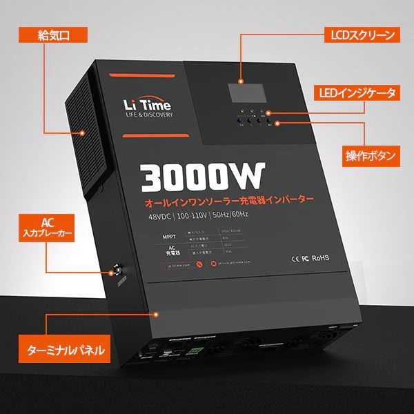 ハイブリッドインバーターは3KWだが、バッテリーが51.2V 100Ahで5KWhしかないので自宅で使うといっても限られる。
