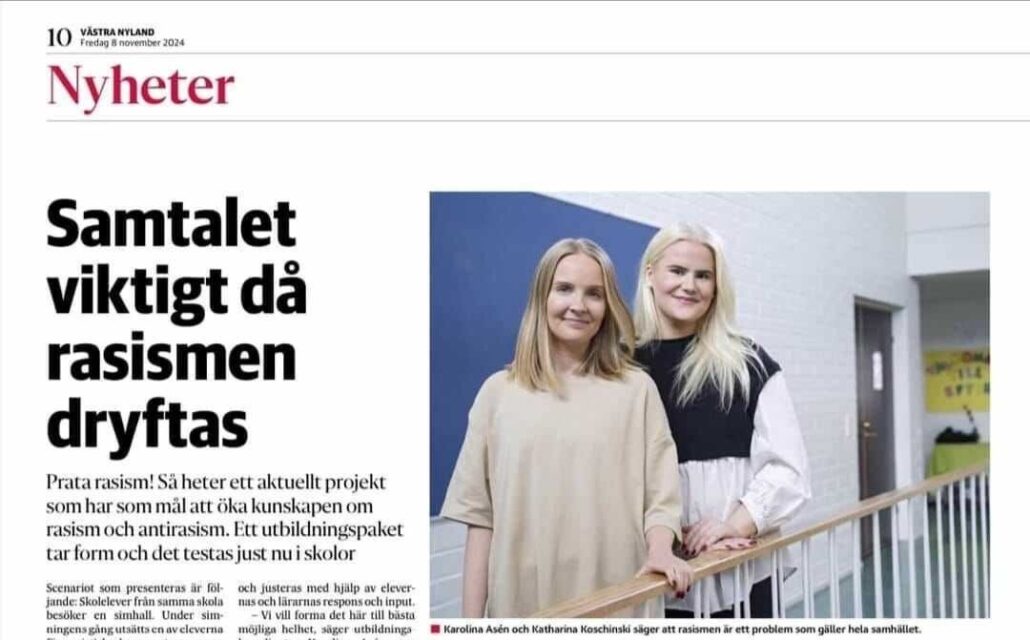 UngInfos ungdomsinformatör Katharina Koschinski och utbildningskoordinator Karolina Asén samt 9:onde klassister i Ekenäs högstadium intervjuades 5.11.2024 om projektet Prata rasism! i tidningen Västra Nyland.