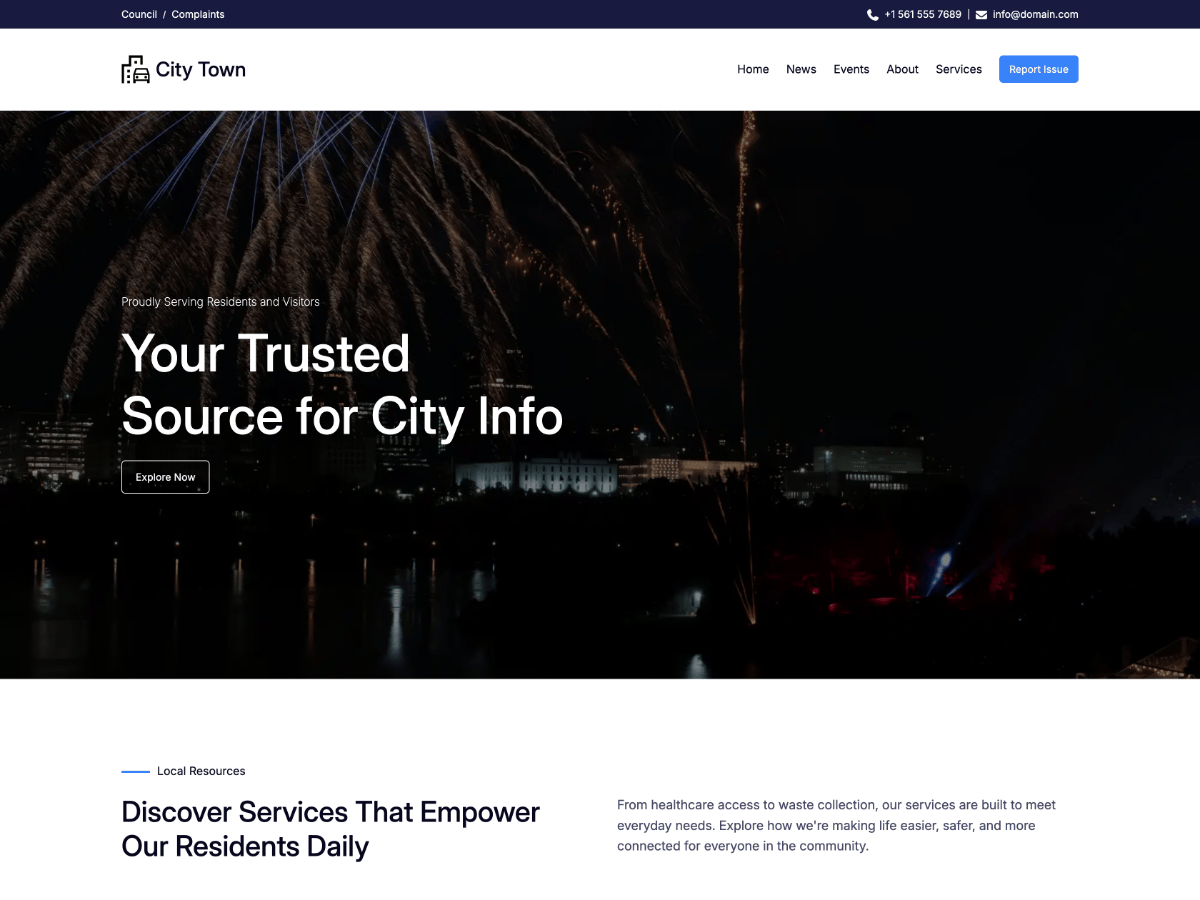 City Government WordPress Theme. The City Town theme is a modern FSE ready block theme designed for building professional local websites. Powered by Gutenberg, it gives full creative control with pre-designed templates and flexible block patterns. The layout adapts smoothly to every device, ensuring a fully responsive experience. With clean code and cross-browser compatibility, the theme delivers fast loading and stable performance. You can easily customize colors, fonts, and sections to create a site that reflects your community, whether it is a village, town, or urban hub. This free theme suits a wide range of municipal and government projects, from local council sites to election guides and political portal pages. Users can highlight important documents, announce events, and support residents with well-structured content. Multiple layouts make it easy to publish township news, share messages from the mayor, or provide details about associations and donations. Because the theme works seamlessly with blocks, updates are simple, and creating engaging content becomes effortless. Its thoughtful design ensures a balance between simplicity and advanced options. Whether you’re building a city directory, local guide, or a townpress style website, City Town provides all the essentials. It combines speed, usability, and attractive styling so users can quickly find what they need. The flexible block system encourages creativity without requiring coding knowledge. Local politics, community activities, and council resources can be displayed in clear sections, improving navigation for visitors. With the support of block-based editing, this theme makes launching a professional portal for your township or urban community easier than ever.