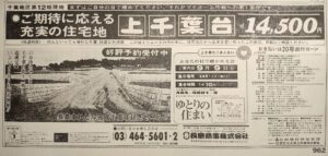 子供の頃千葉市に住んでいて親が読売新聞を購読していましたので「第1の広告」は見ていたと思います。この不動産屋さんではないかも知れませんが西船橋を案内所とする広告も見たような気がします。東京の会社が西船橋駅前にテントを張って受付して、旗を持った社員さんに引率されて、バスで連れていくのかなぁと子供ながらに妄想していました。