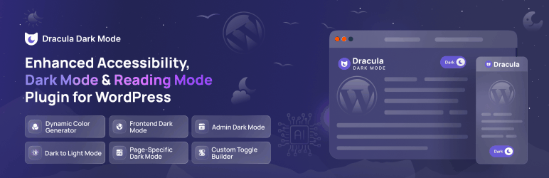 Dracula Dark Mode effortlessly transforms your WordPress site into a visually stunning dark theme using an advanced dark mode algorithm. Designed to reduce eye strain, its adaptive interface seamlessly integrates with your website’s design, making it the ultimate dark mode solution.