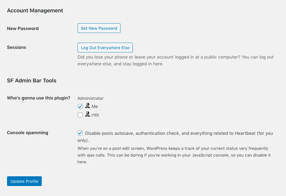 sf-admin-bar-toolsfolder to your wp-content/plugins/ directory. - Activate the plugin from the «Plugins» page.