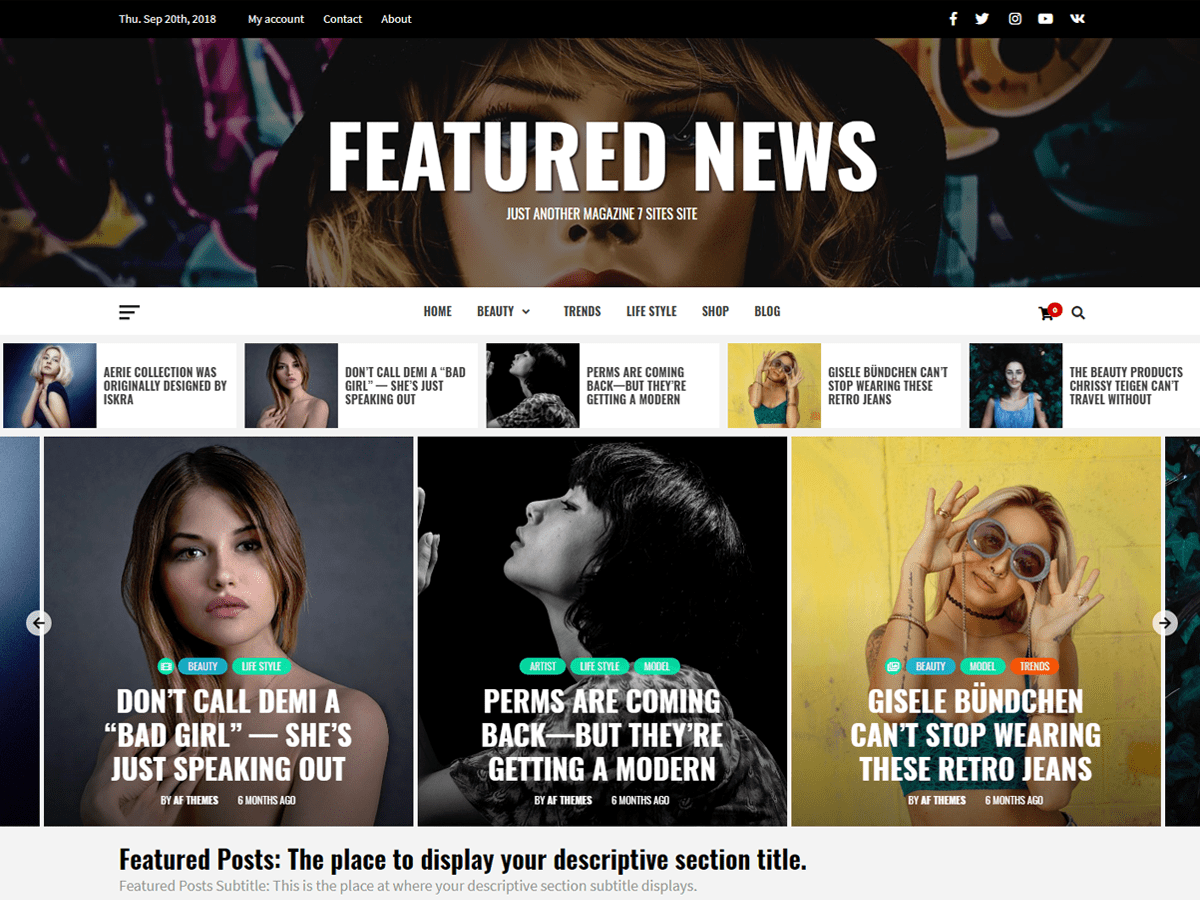 Featured News is a child theme of Magazine 7. The theme has different fonts and color setup. Furthermore, the theme altered some of the default value to other available settings, like frontpage section and archive layout. With the help of available customizer options along with widgets, you can implement layouts as a clean and minimal blogging site, modern fashion blog, photography blog, wedding blog & magazine and even more. The theme is SEO friendly with optimized code and awesome support.