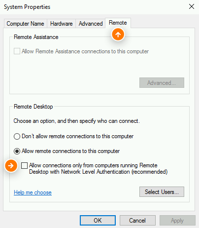 In your administrator session in V2 Cloud; open Control Panel and go to System. Select Advanced network setting and go to Remote. Uncheck the last option to disable Network Level Authentication.