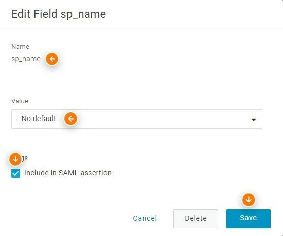 Go to Parameter on the left sidebar and click on the + (PLUS). Enter sp_name in the attribute, select – No default – and check Include in SAML assertion. Click Save.