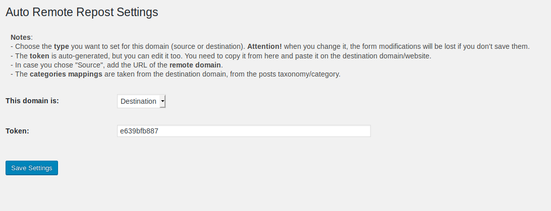 The «token» offers a security mechanism to insure the post is sent to the right domain. It is automatically generated by the plugin on the «Source» site and you have to copy it exactly from there and paste it on the «Destination» domain.