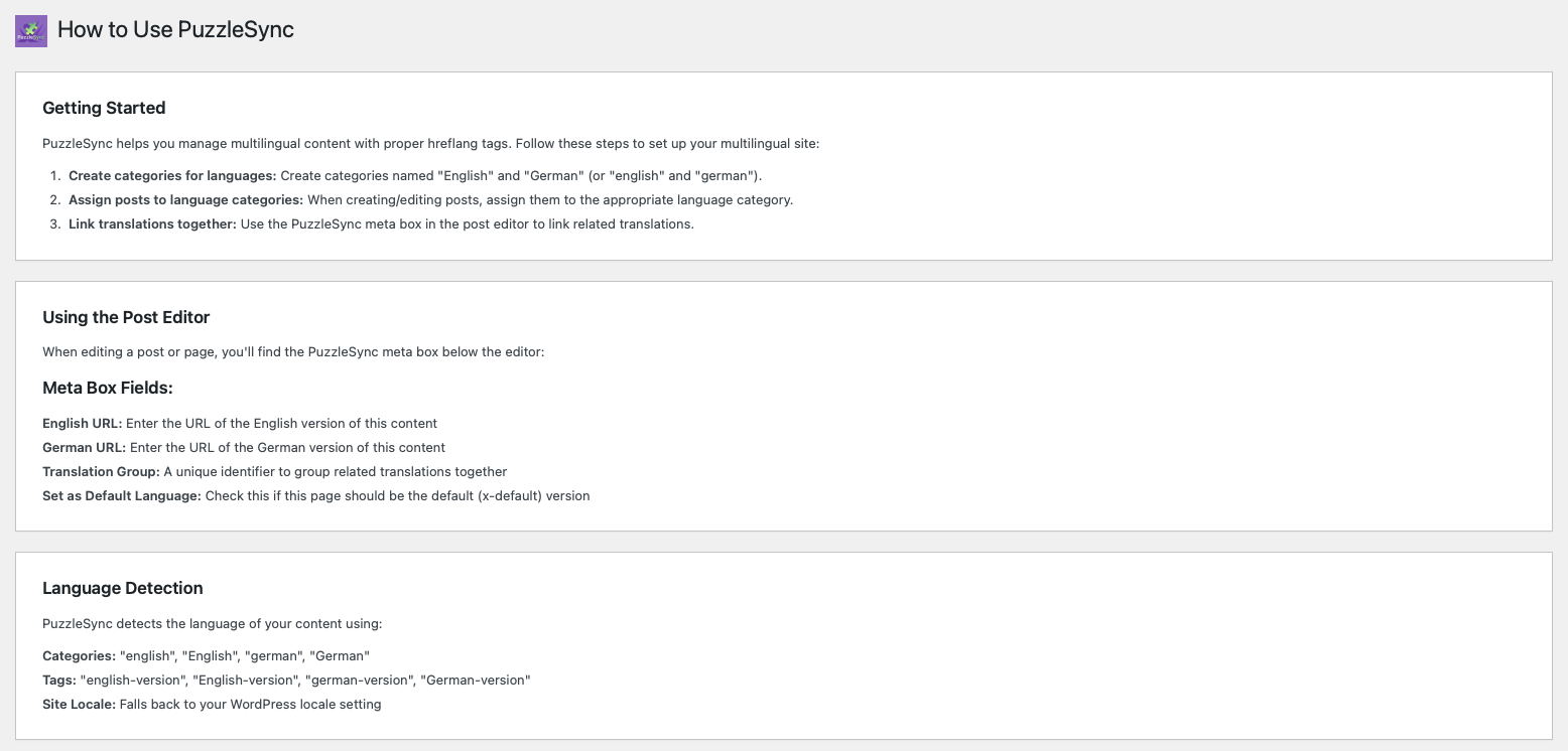 - Link Translations: Use the same Translation Group name in the PuzzleSync meta box for related posts