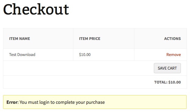 The error message that shows when “Disable Guest Checkout” is enabled, but “Show Register / Login Form?” is not