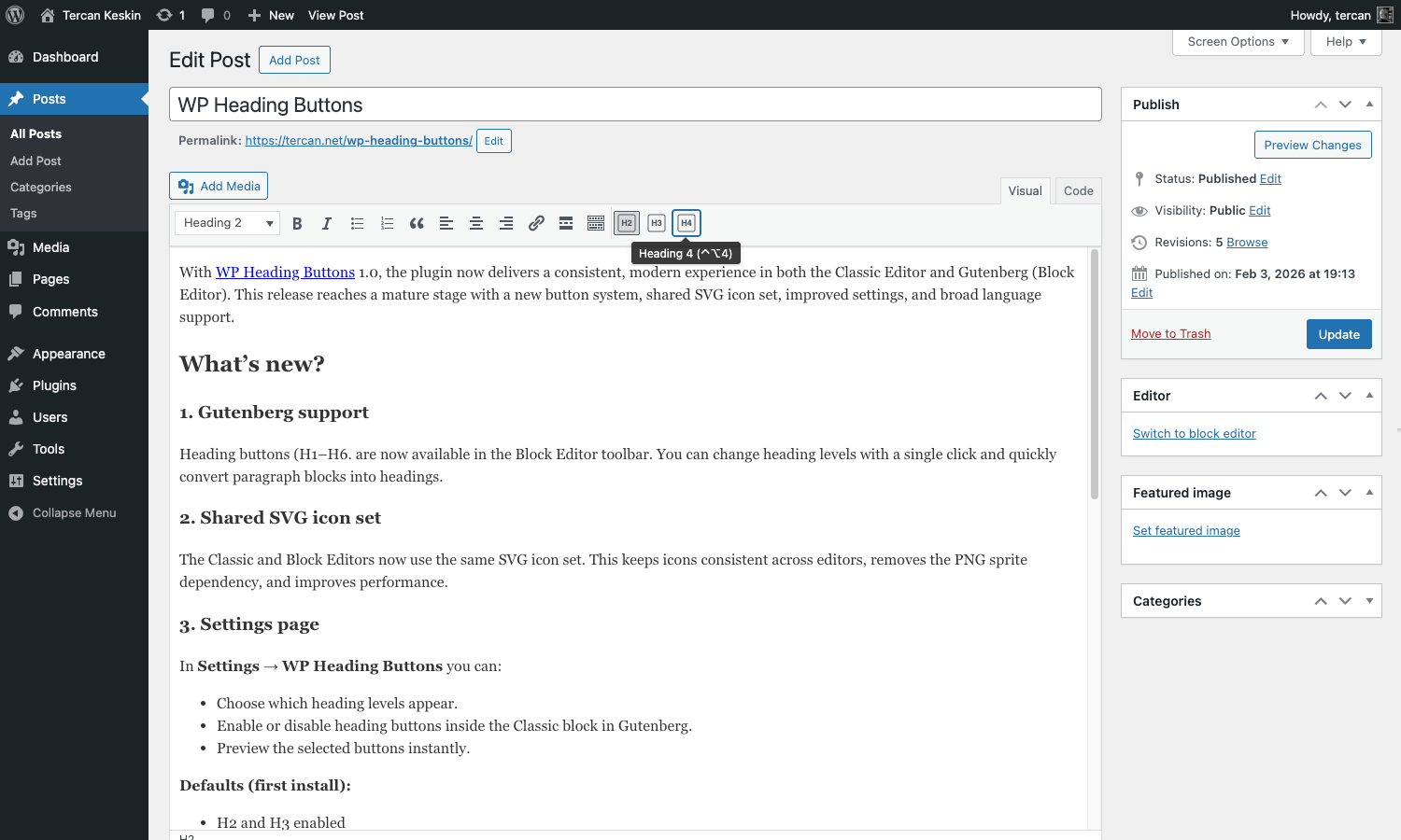 WP Heading Buttons adds quick heading buttons (H1-H6) to both Classic Editor (TinyMCE) and Block Editor toolbars.