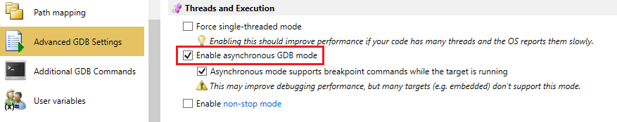 If enabling asynchronous mode causes errors with setting/removing breakpoints, try disabling the “asynchronous mode supports breakpoint commands” setting below the “asynchronous mode” checkbox. This will force GDB to stop the target for setting breakpoints even when using asynchronous mode.