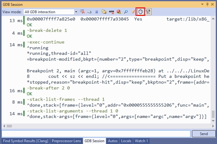You can also view the GDB commands in real time using the GDB Session window. If you are tracking down slow performance, enabling the timing mode will show how much time exactly each of the commands took: