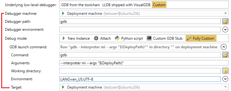 WARNING! If you are switching to run the GDB on a different machine, make sure the application is uploaded to that machine and that you are using the correct path. In most of the cases, simply changing $(TargetPath) to $(DeployPath) should sufficient. You do not need to upload the source files to the machine where gdb is running, however if VisualGDB has trouble finding