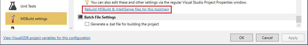 You can use the “Rebuild MSBuild & IntelliSense files for this toolchain” link to automatically update the MSBuild-level properties based on VisualGDB-level properties:
