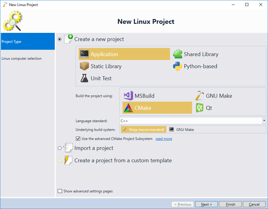 - First, we will create a regular Advanced CMake project. Open the VisualGDB Linux Project Wizard: