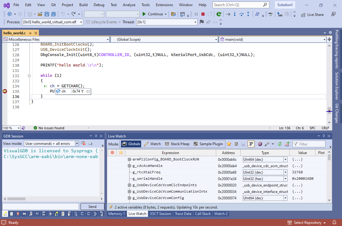Make sure the build succeeds and take a note of the built executable name (hello_world_virtual_com.elf in this example) - Now that the example was built successfully, you can debug it from Visual Studio using the VisualGDB Quick Debug feature. Start Visual Studio and select Debug->Quick Debug with GDB: