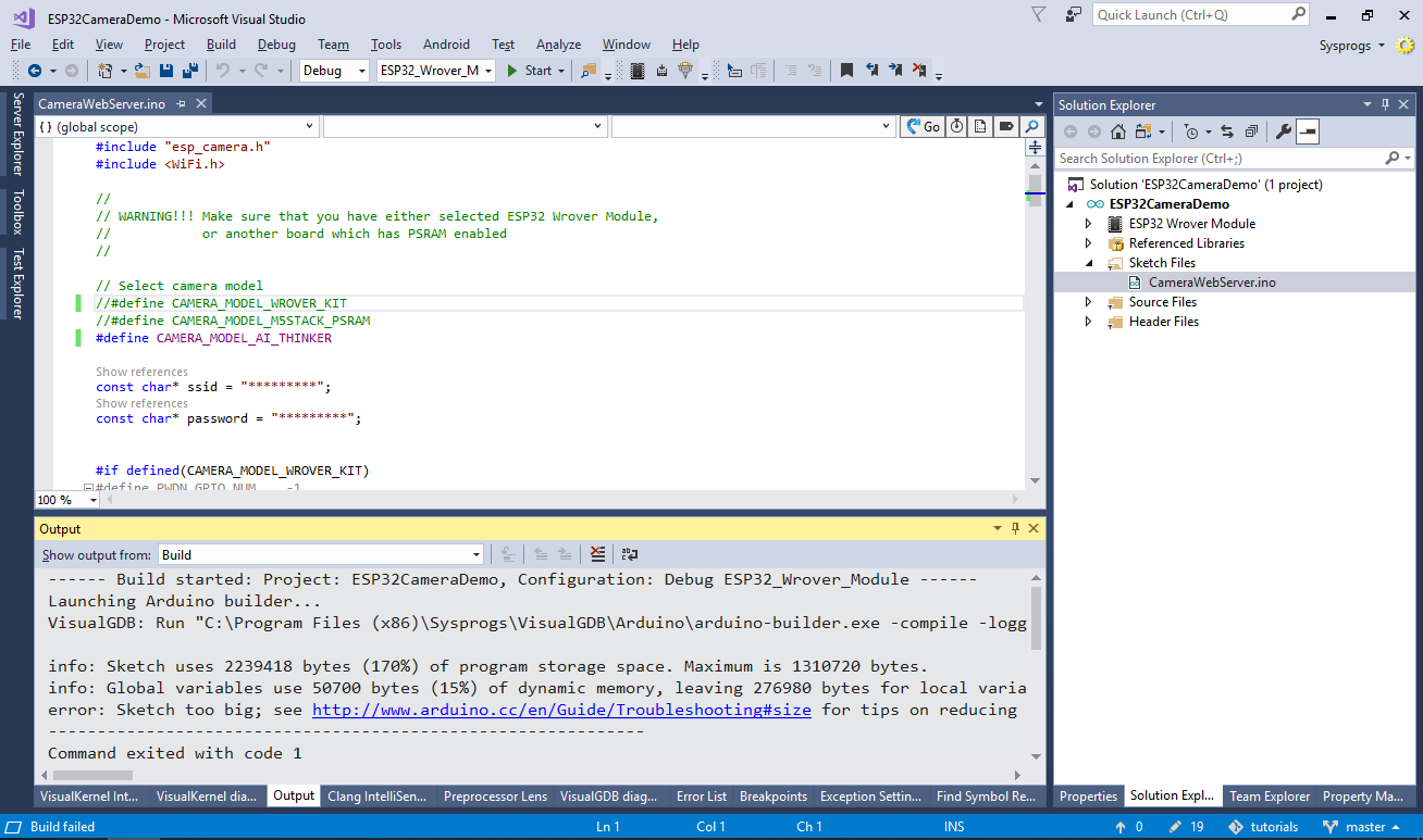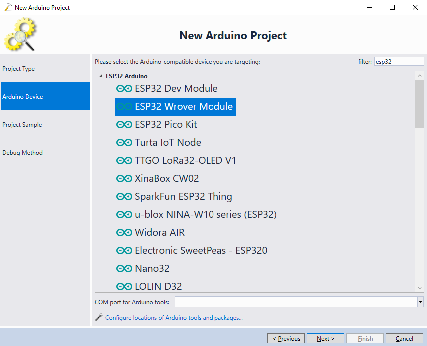 - The best ready-to-use ESP32 camera example is included in the ESP32 Arduino package, so we will use the Arduino workflow in this tutorial. As long as you are using VisualGDB 5.4 or later, it will automatically install the necessary tools and packages for you as you create the project. Hence start Visual Studio and open the VisualGDB Arduino Project Wizard: