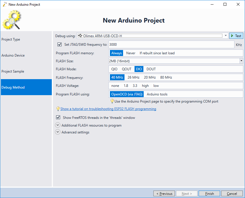 - Connect your JTAG debugger via USB and select it on the Debug Method page. Then click “Test” to verify the wiring: