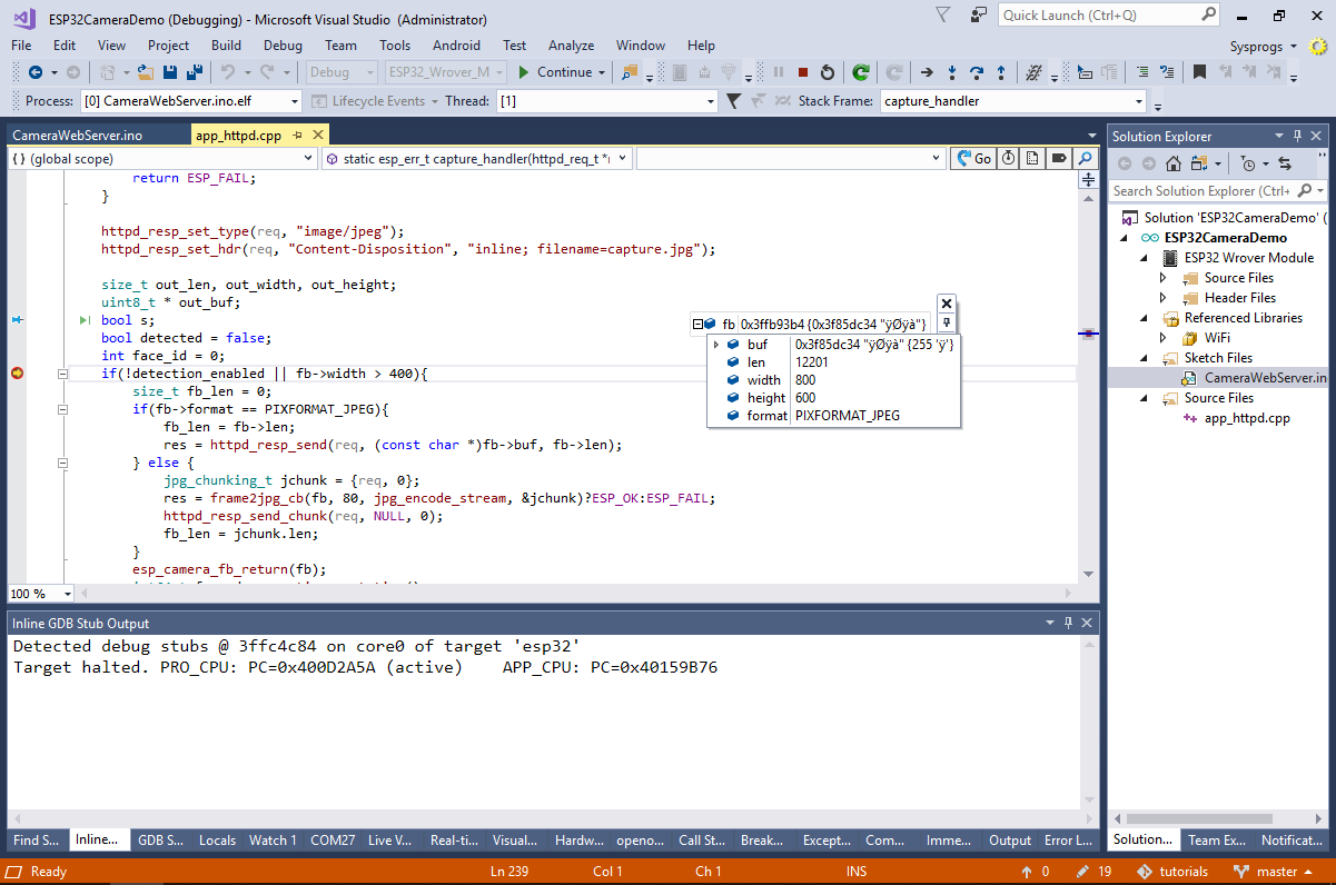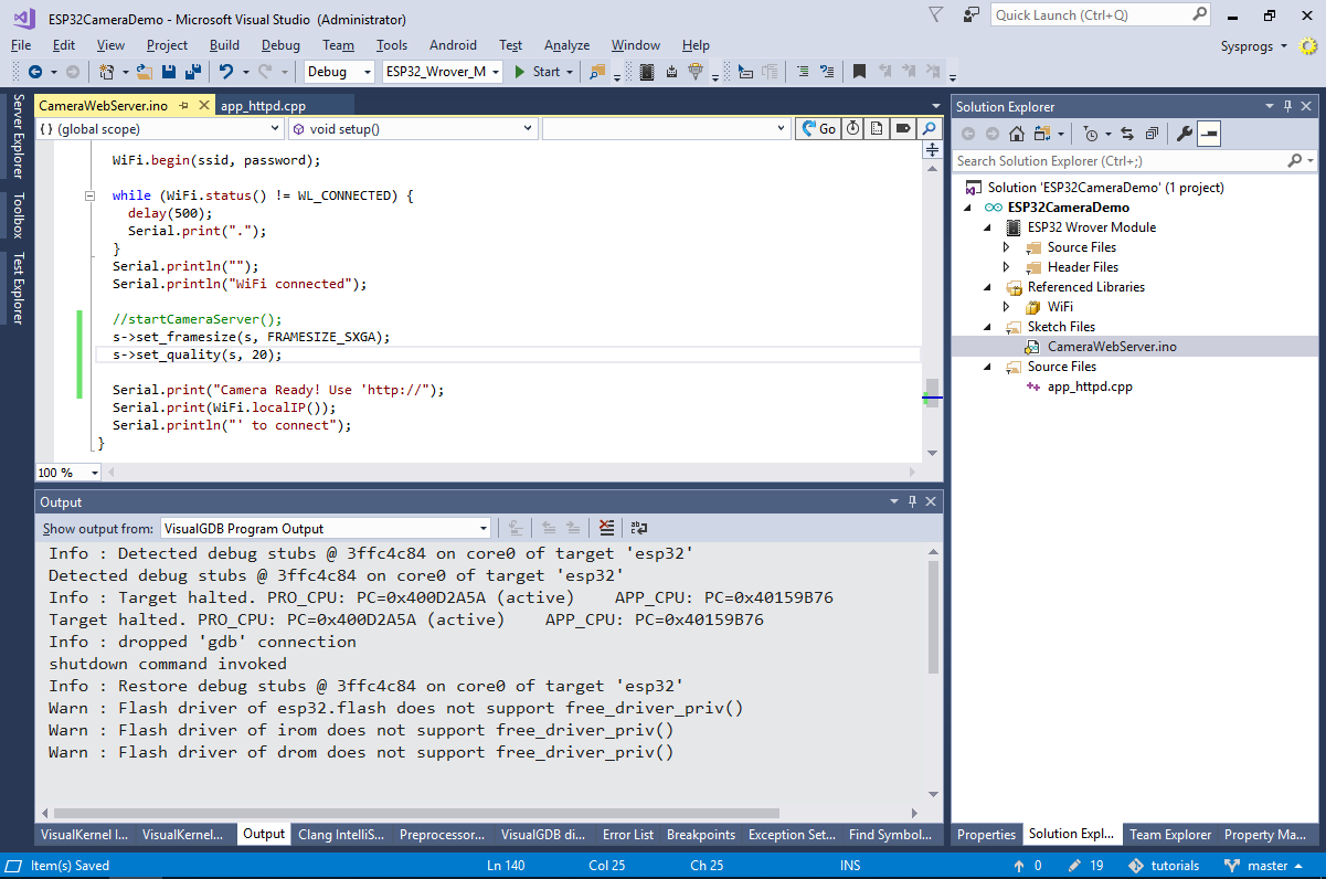 - Start debugging by pressing F5. VisualGDB will automatically program the FLASH memory and start the program. If you have connected the serial output of the module, you will see the IP address of the camera displayed there: