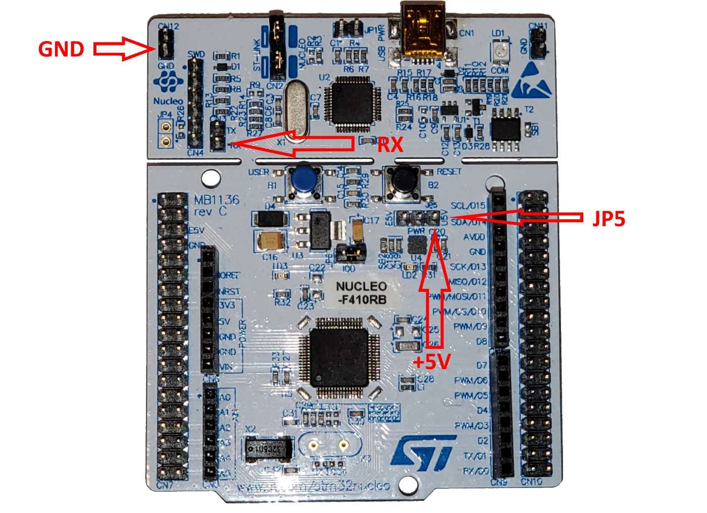 As the ESP32-CAM board does not come with a USB connector, you would need to use an external 5V power source. In this tutorial we will use a Nucleo board from ST Microelectronics as a 5V source and will also use its 3.3V UART interface provided by the on-board ST-Link to receive the text output from the ESP32-CAM module. If you are using the Nucleo board, remove the JP5 jumper (powering the STM32 microcontroler on the board) and connect the GND, +5V and RX signals to the ESP32-CAM module as shown below: