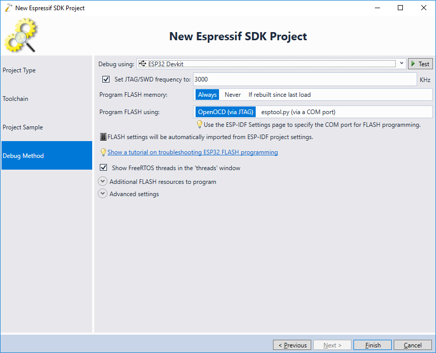 - Finally, choose the debugging settings that match your target. The ESP32-WROVER module comes with an on-board JTAG programmer, so enabling JTAG debugging via jumpers and plugging the board in should be sufficient for VisualGDB to detect it. In case of any problems, follow our ESP32-WROVER tutorial to get debugging to work: