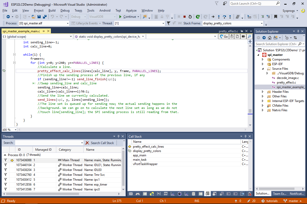 - Now we will look into the internals of the example to understand the involved components. Run the Debug->Break All command and switch to the main thread via the Threads view. You should see the pretty_effect_calc_lines() function being called by display_pretty_colors():