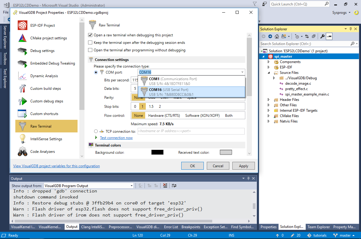 - Before we add the logic for downloading the JPG file from a given URL, run the current version of the firmware to test the Wi-Fi connection. If you are using the custom version of VisualGDB, try enabling the raw terminal on the WROVER’s COM port so that you can see the diagnostic messages from the board:
